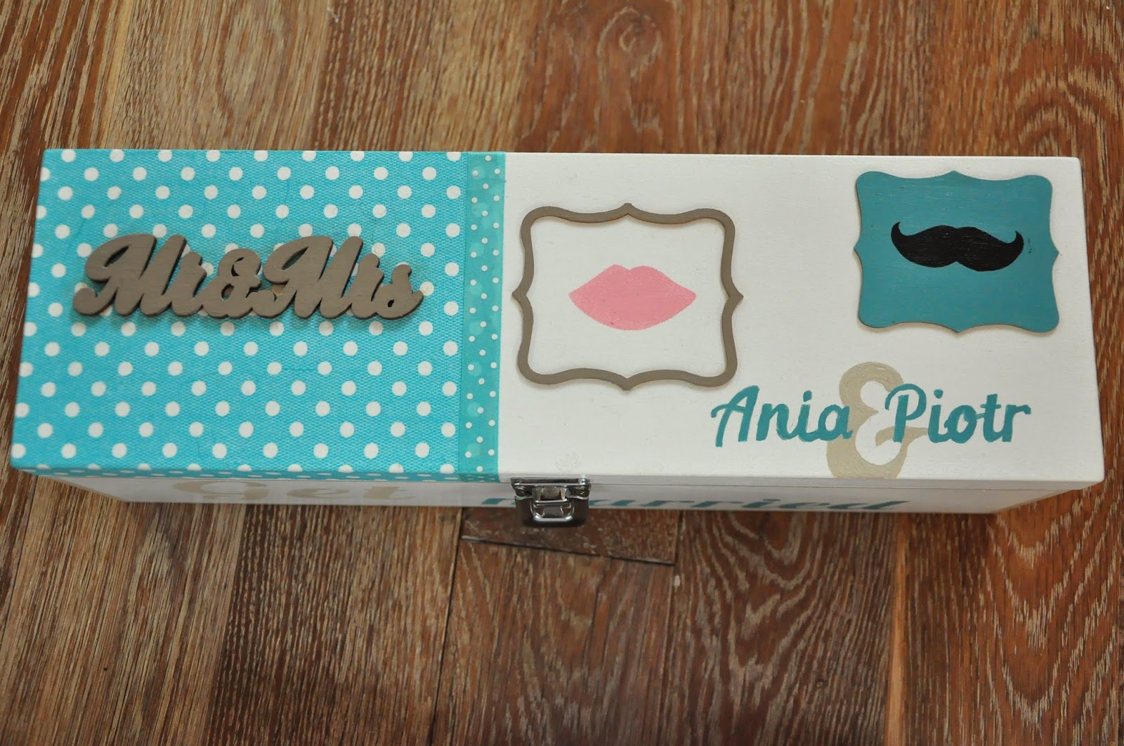 Kolejna mała skrzynka na wielką okazję – tym razem ślub i to nie byle kogo bo osobistej szwagierki. Miętowe dodatki obecne w zaproszeniu, etykietach na stole i innych dekoracjach nadały charakter skrzynce, w której młoda para otrzymała wino. W zaproszeniu grafik użył niezwykle uroczej, nieco retro czcionki Lobster, dlatego i ja ochoczo skorzystałam z tego motywu w napisach na skrzyneczce. Pasków i kropek nie mogło zabraknąć:).