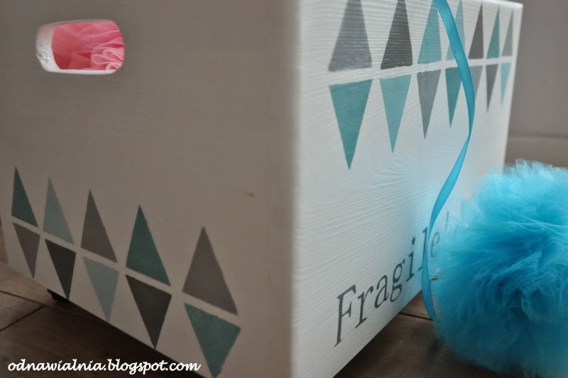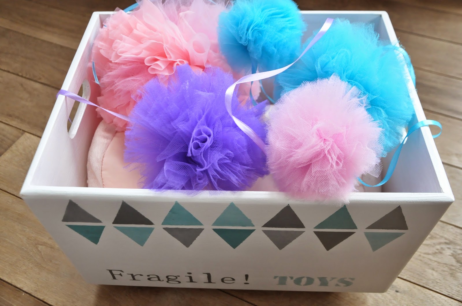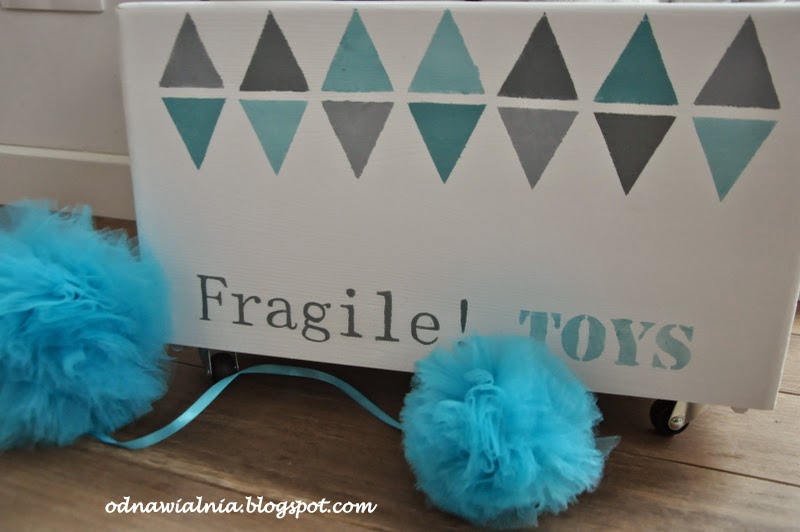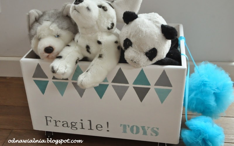 Kolejna skrzynka na zabawki. Wiem, to już robi się podejrzane, ale to są takie wdzięczne obiekty do dekoracji, że nie mogłam się powstrzymać z zakupem, gdy w LM była wyprzedaż:). W tej trzymamy tylko najważniejsze i delikatne skarby, a więc w opinii mojej córki – pies husky, dalmatyńczyk i panda. Równocześnie powstało parę tiulowych pomponów, które dorzuciłam do sesji foto.