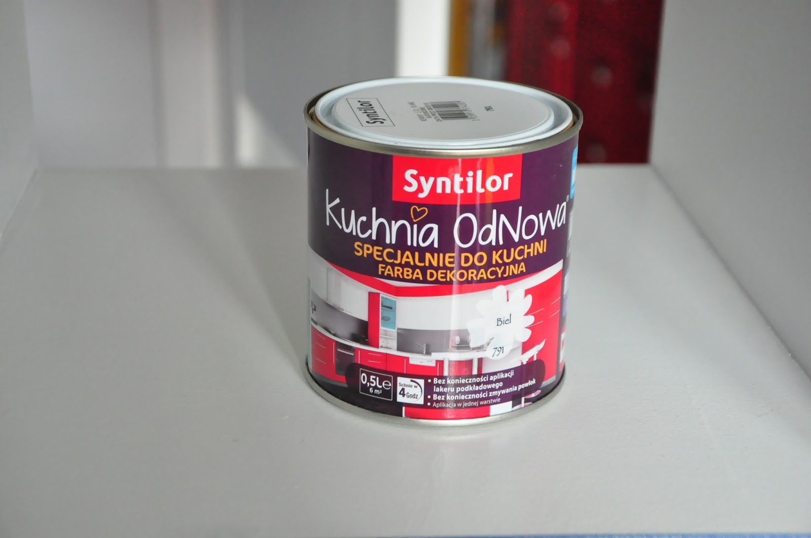 Jeżeli tak jak ja nie zastosowałaś podkładu możesz pokryć mebel inną, bardziej trwałą farbą. Ja wykorzystałam do tego celu farbę styntilor do malowania kuchni. Producent zapewnia dużą przyczepność w tym do oklein, laminatów itp. Wadą rozwiązania jest lekki połysk, zaletą – nie musisz zdzierać farby i nanosić zgodnie z przykazaniem podkładu i farby.