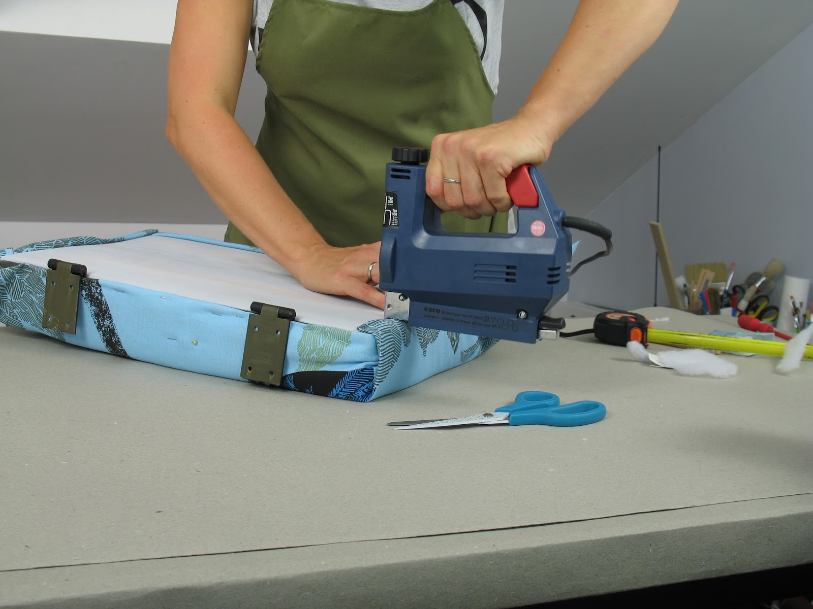 przypadku tak, ze tkaninę podwijamy na brzegach i przyczepiamy takerem w