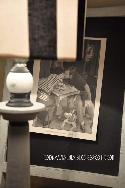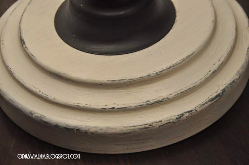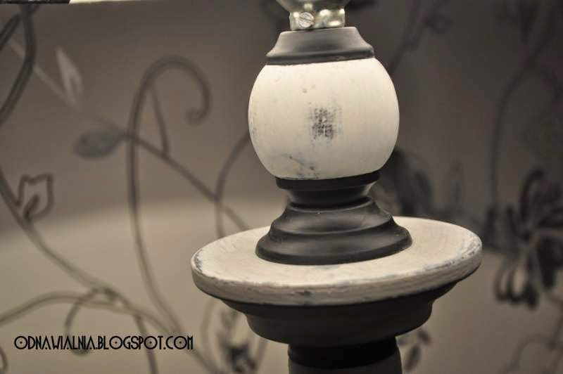 Ta lampa czekała na mnie długo: najpierw na stadionie Olimpia, gdzie stała sobie brudna i pokrzywiona, potem na strychu u mnie w domu, by wreszcie dostać nowy kolor nóżki i oczywiście abażur. Wszelkiej maści wygięcia, toczenia od razu kojarzą się ze stylem shabby shic, ale białe przecierki pojawiły się tylko na stelażu. Abażur to wyraziste czarno-białe pasy, dzięki którym od razu robi się charakternie.