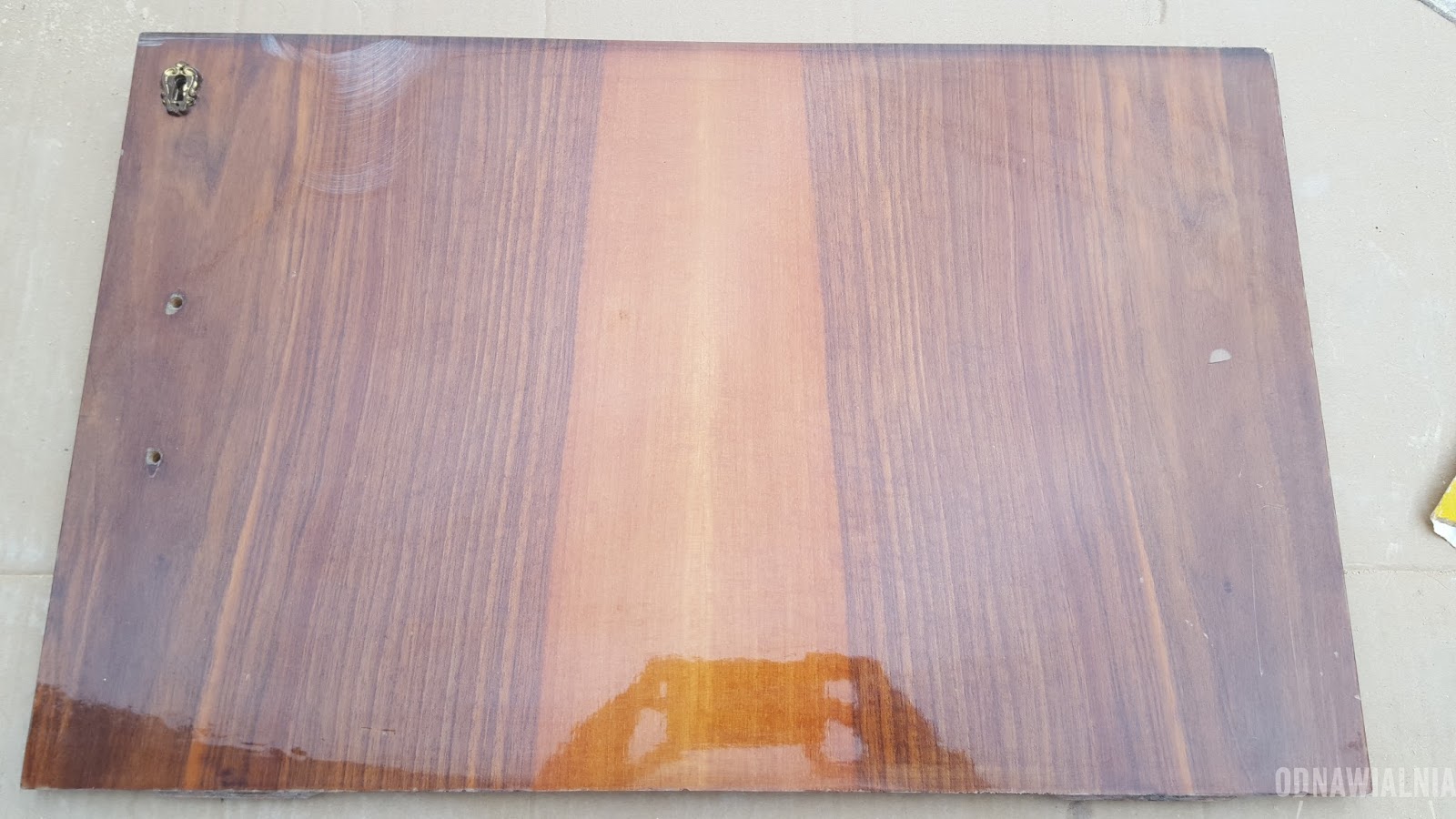 Front (ten niezniszczony) po wygładzeniu wyglądał już tak. Plama obok to warstwa bejcy – chciałam zmienić nieco czerwonawy odcień forniru na bardziej brązowy. Ta bejca to orzech z firmy colorit.