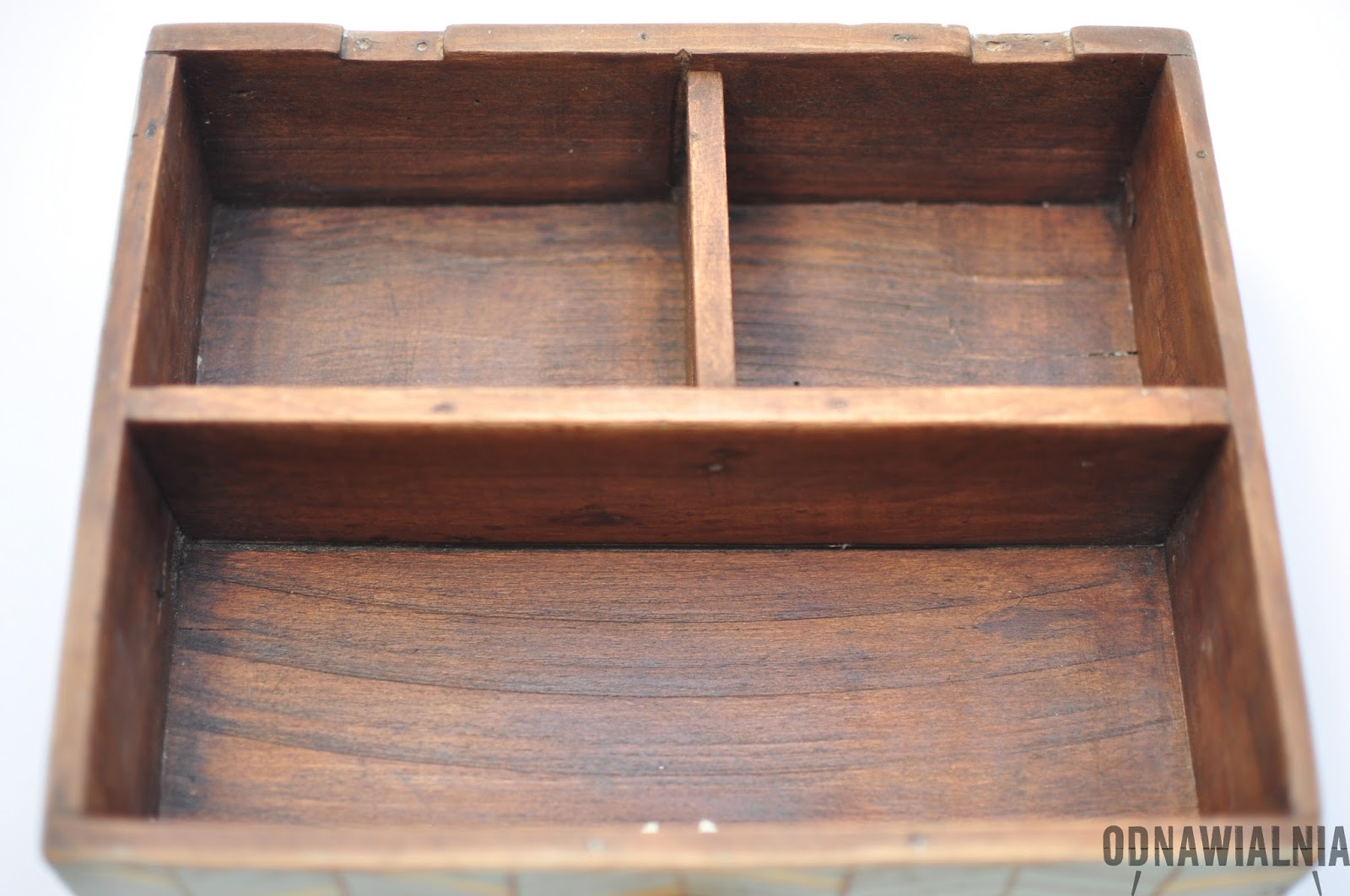 Trafiła mi się taka miła szufladka w piwnicy dziadka. Zapewniam was, że początkowo wyglądała tragicznie (niestety nie mam zdjęcia sprzed), cała pogryziona przez kołatki, brudna. Jednak stare drewno leżące w piwnicy ma swój urok, po umyciu, przeszlifowaniu ręcznym i zabejcowaniu drewno wewnątrz skrzynki nabrało tego wspaniałego, starego looku (który w niej drzemał przykryty warstwą brudu). Żeby to osiągnąć na nowym kawałku, musiałabym ryć, szczotkować, woskować ciemnym woskiem.