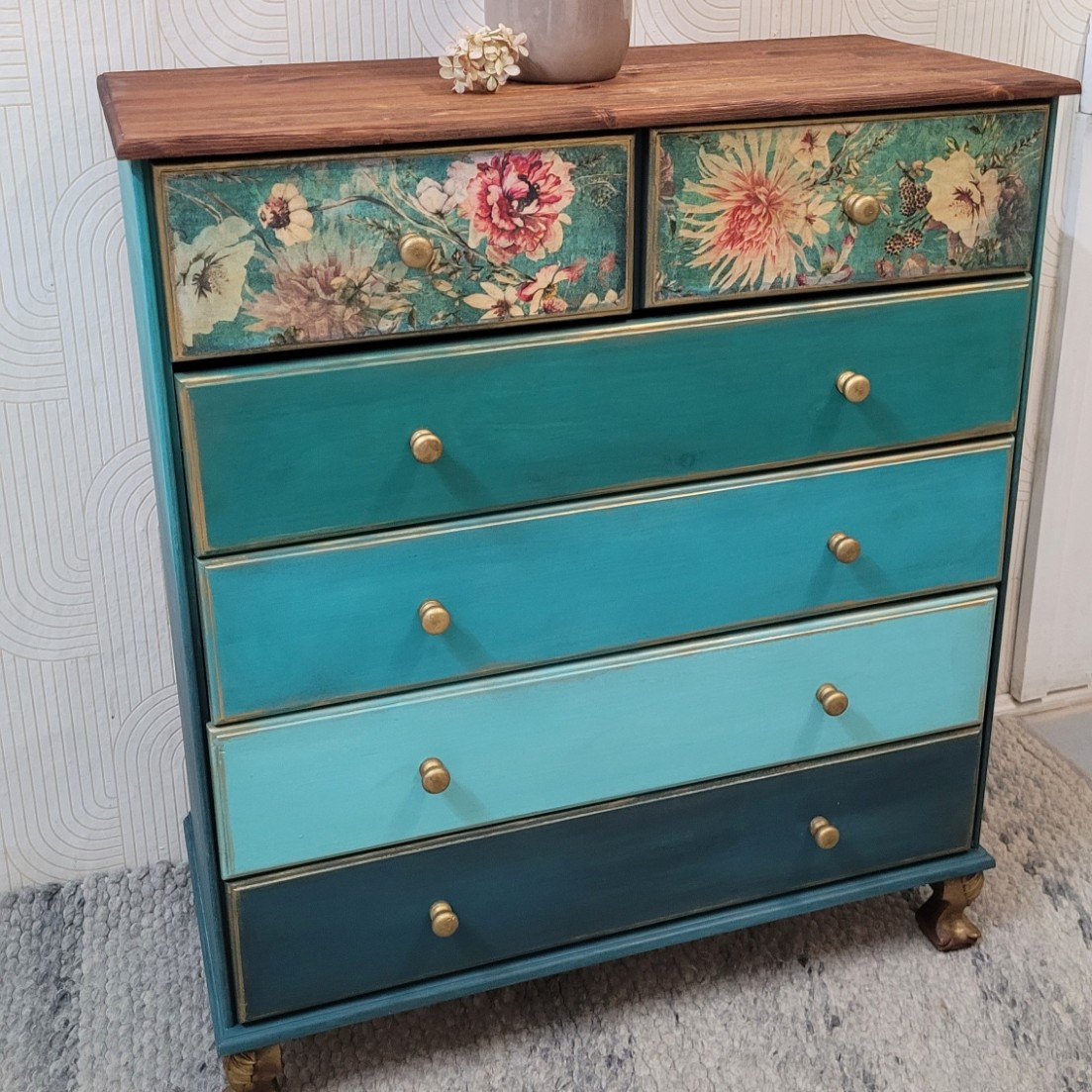 - tworzenie kompozycji – dobranie dekoracji do stylistyki mebla, tak aby całość współgrała ze sobą, nie była kiczowata lub przeładowana dekoracjami,